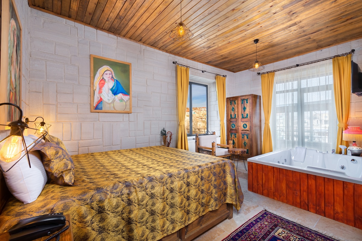 Experience an authentic stay in Cappadocia at Portal Cappadocia in the heart of Ortahisar. This Deluxe Stone Room blends traditional stone architecture with modern comfort in a peaceful adults-only boutique cave hotel. Guests enjoy access to the panoramic terrace and a heated outdoor infinity pool overlooking the unique Cappadocia landscape.