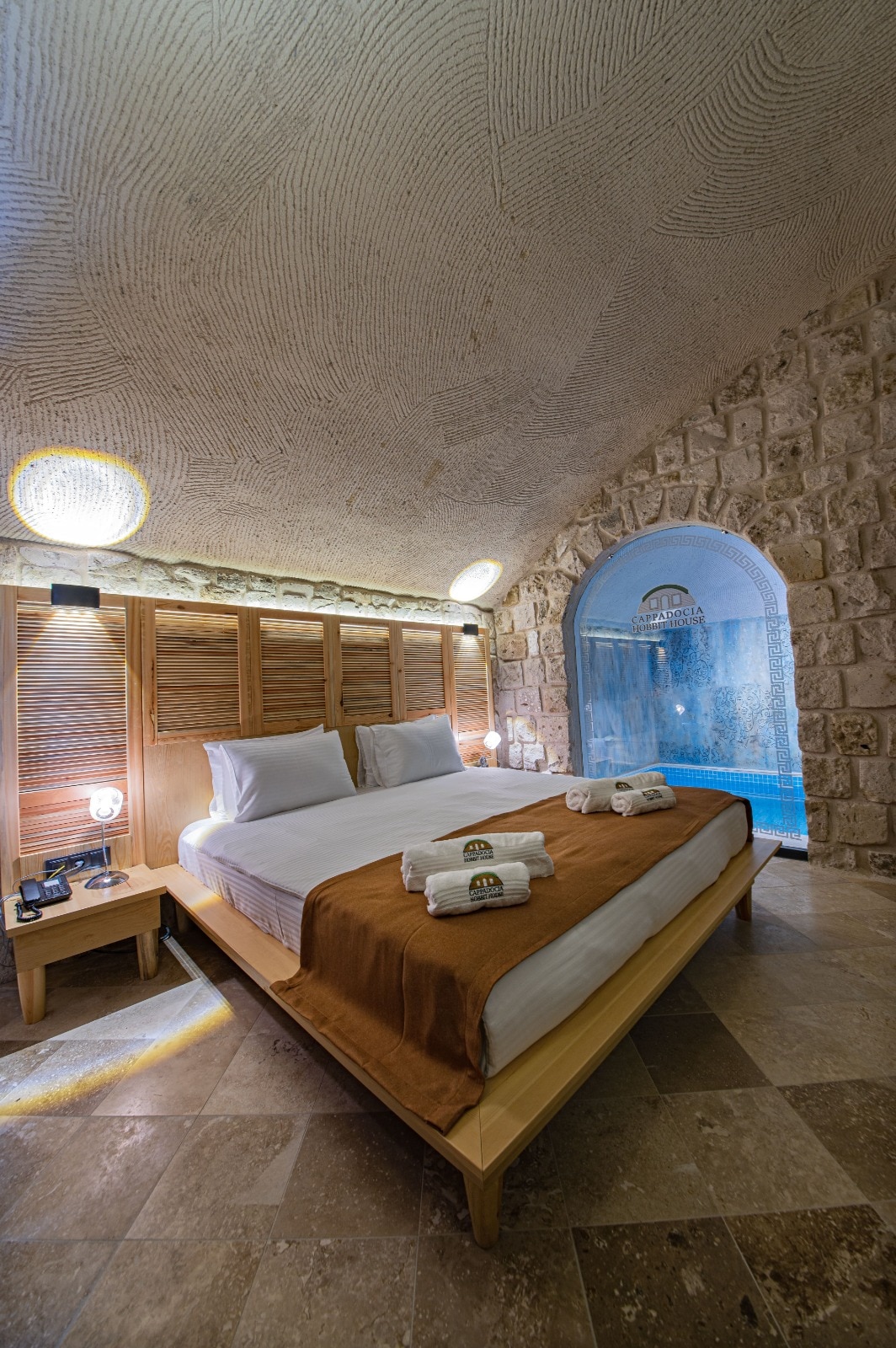 Kapadokya’da 53 m²’lik King Pool Room’da doğal taş ve kemerli tavanların mistik atmosferinde konaklayın. Özel siyah su havuzu, odun sobası, yerden ısıtma, XXL yatak, çift duş, çift lavabo ve balkon ile modern konforu yaşayın. Kişisel bakım seti ve lüks detaylarla unutulmaz bir mağara deneyimi sizi bekliyor.