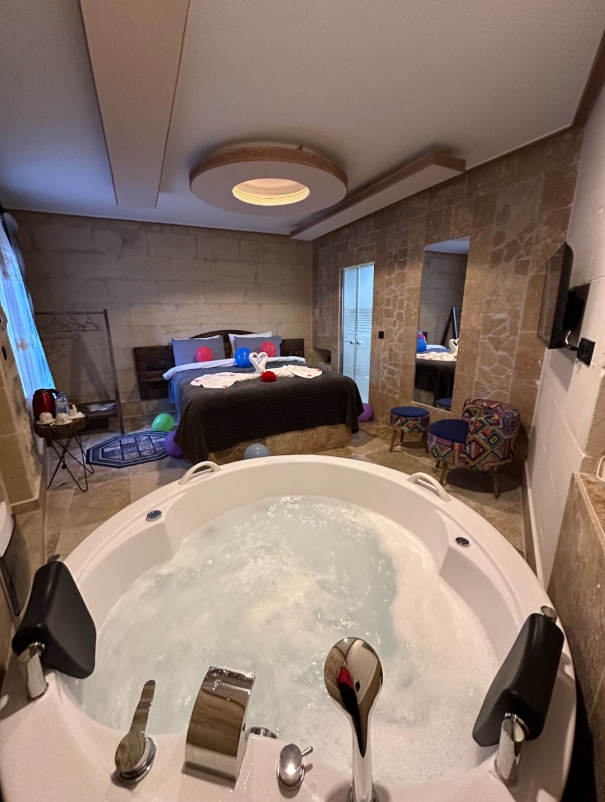 Bu son moda mekân birçok cazip detay sunuyor. Breakfast fire place romanric room Cave experience beautiful nature