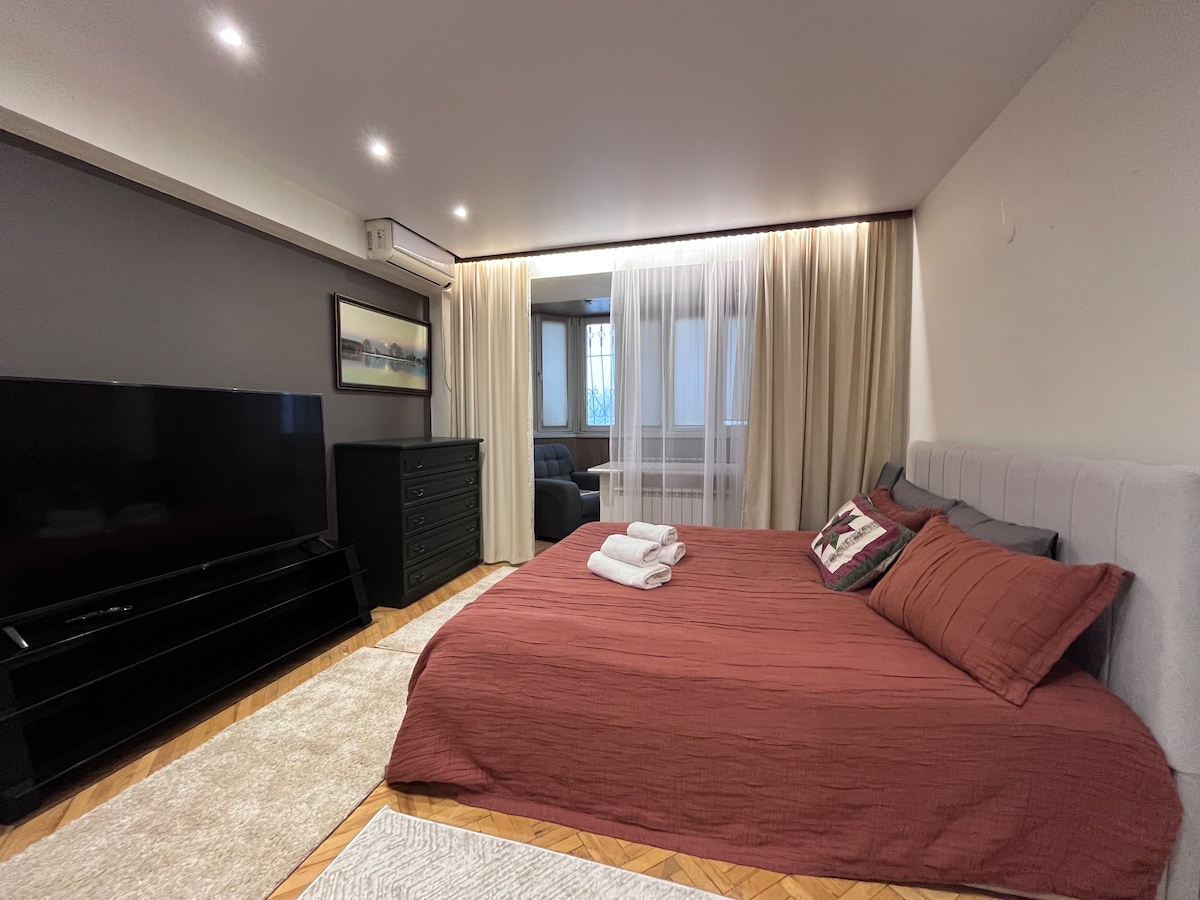 A stylish modern flat is a great option for leisure and business trips. Located in the center of Almaty, 100 m from Abaya Street. Nearby are the circus, the Sports Palace, the Republic Palace, the central stadium, the cable car, Lermontov Theater, Mukhtar Auezov Theater. The studio is fully equipped for 2 people: a sofa, a double bed, a kitchen area with necessary appliances, a bathroom, a large TV and high-speed WiFi. Windows with mountain views and a quiet courtyard.