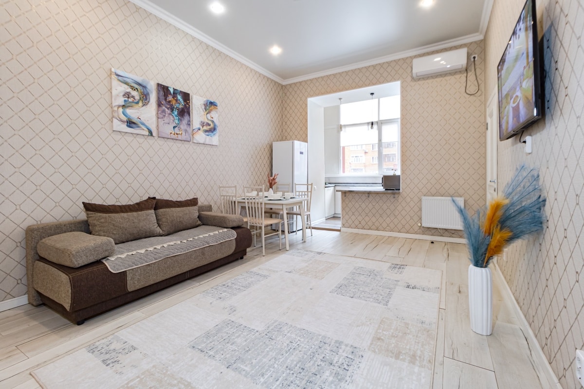 Шикарная студия с дизайнерским качественным ремонтом. В квартире всё новое и свежее. Есть всё необходимое для комфортного отдыха и проживания. Постоянно поддерживается идеальная чистота. Белье всегда свежее и застелено. Красивая, удобная двуспальная кровать. Диван можно раскладывать. Кухня полностью укомплектована всем необходимым для подогрева, сохранения и приготовления пищи.