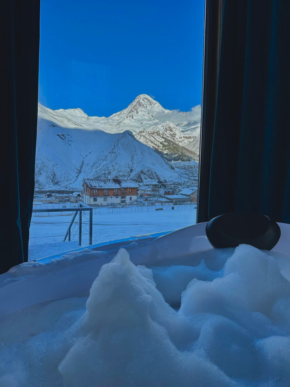 The place is very peacfull and privat, views are very special and free, we have Privat Big terrace, Unically peacfull bedroom with panoramic view of great Kazbegi Mountains, big yeard and outdoor furniture .