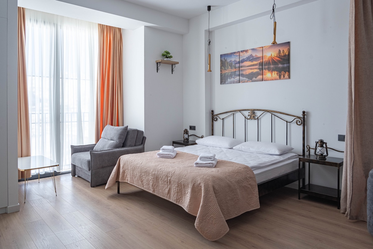 Welcome to our bright and cozy apartment in the heart of New Gudauri! Just steps away from the ski resort, gondola, and ice rink. Our stylish home features a balcony with stunning mountain views, a fully equipped kitchen, comfortable bedroom, two sofa beds, and a ski storage area. Experience comfort, style, and the magic of Gudauri all in one place!