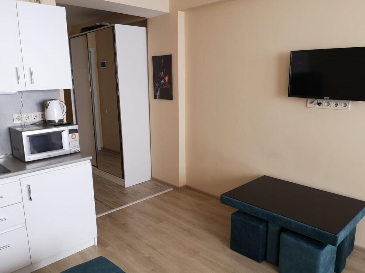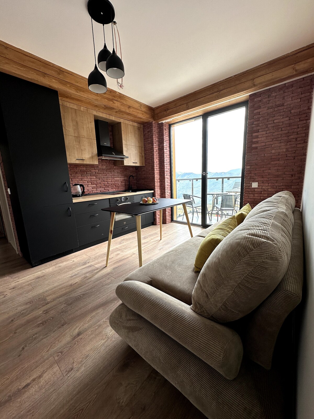 Welcome to the studio in Gudauri, Georgia, at an altitude of 2200 metres! Fresh renovation with wood and stone creates a cosy mountain atmosphere. Perfect lighting, functional areas - living room, bedroom, kitchen with panoramic windows giving natural light. The sunny side offers stunning mountain views. Close to the ski lift, shops and restaurants - ideal for a ski holiday. This studio combines style, comfort and functionality for an unforgettable holiday.