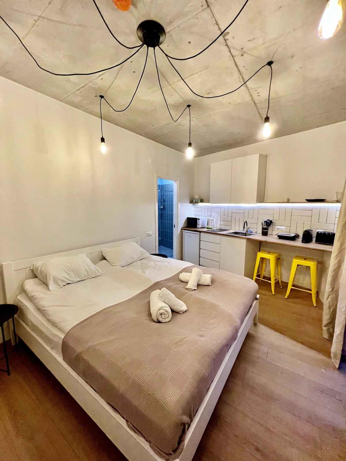 Enjoy Netflix, board games, books and a wonderful mountain view of the studio apartment in New Gudauri, Loft 2 with cosy Balcony. A perfect place for friends or family is around 50 meters away from the main Gondola ski lift. WiFi, safe, sky-depot and 24/7 front desk is included into the price. The Apartment features a well-equipped kitchenette with an induction hub, microwave, sandwich-maker, electric teapot and a fridge. There is a bathroom with a shower.
