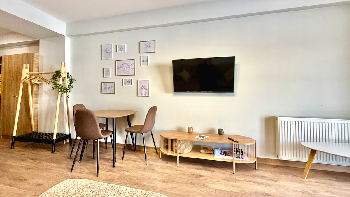 Dear guests, if you'd like to stay in a cozy luxury apartment with astonishing mountain views and a 1-minute walking distance to the ski loft, mini-market, and restaurants, this is the best place for you to stay. The apartment is fully equipped with everything you might need for your stay. Apartment features include a Wi-Fi, smart TV, queen-size bed, folding sofa, full kitchenette, bath with a hairdryer, and more. As a bonus, there is a ski rink right in front of the apartment. why wait? Book
