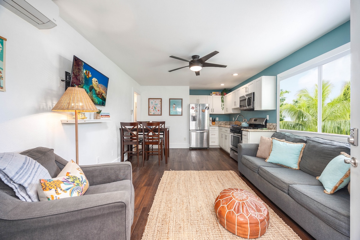 Relax in complete privacy at your newly renovated end-unit retreat, nestled among tropical greenery and filled with high-end touches. From the spa-style bathroom to the gourmet kitchen, every detail is designed for your comfort and care. Sip fresh espresso surrounded by original art from noted local artists, South Pacific antiques, and the cool air of a powerful split A/C. Modeled after 5-star Hawaiian resort bungalows, this peaceful hideaway invites you to unwind in quiet luxury.