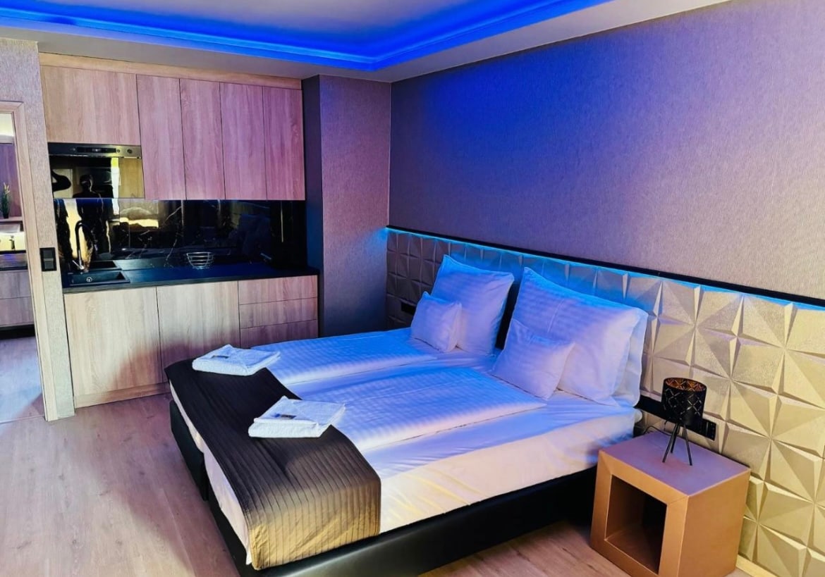 Az apartman Kiskunfélegyháza központjában található. Magán szálláshelyként üzemel.Éttermek,boltok,fagyizók,100-200 méteren belül.Gyalogosan könnyen elérhető minden. Az épület teljesen új berendezési tárgyaival,bútoraival,nyílászárókkal,redőnnyel,2 db klímával szolgálja a vendégek teljes kényelmét. Kilátással a belső parkosított térre. Az apartmanhoz tartozik terasz,de az udvaron is található egy közös kerthelyiség.A ház előtt ingyenes parkolási lehetőség.A klíma,a nyári időszakban fizetős,5€/éj