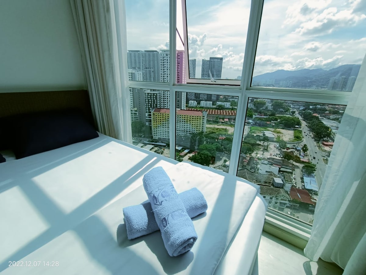 Our brand new cosy suite is perfectly located in the heart of Penang with easy access to local tourist attractions. Japanese/Korean Restaurants & 7-11 convenience store are right below our home! Local food, KFC & Pizza Hut is within 5 mins walk! We Provide • Great hospitality services • Sunrise & City View • PS3 Entertainment & Netflix • 1 Private car park • 100 Mbps WiFi • Infinity Pool View • Fully air-conditioned If you like a quiet & cosy place in this busy city, Don't Wait, Book Now!!!