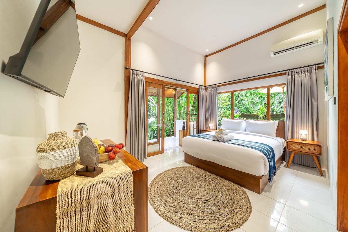 Tranquil 1BR hideaway in Ubud’s Penestanan / Sayan area: • 1 cozy air-conditioned bedroom with garden views • Bathroom with walk-in shower + amenities • Private patio with seating — perfect for morning coffee • Lush tropical garden setting • 2 swimming pools (shared) for sun time & relaxing dips • Daily cleaning with fresh towels & linens • Calm, green surroundings — made for rest and reset • 300 Mbps Wi-Fi • Netflix & PS5, baby amenities on request • Concierge service for tours, spa & more