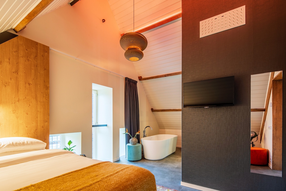 A five-bed cottage of 65 m² with stairs leading to a unique second bedroom with a glass skylight and perfect views of our Dutch landscape. Large sliding doors on the ground floor open onto a private terrace with loungers and a private wood-fired hot tub next to it. The Lighthouse is fully equipped, including two large bedrooms, a sofa bed in the living room, a full kitchen with oven, dishwasher and Quooker.