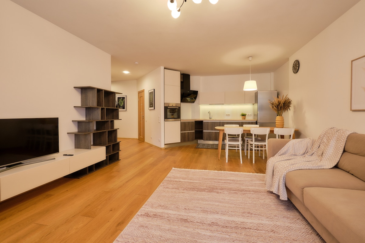 Stylish, bright, and well-equipped 1-bedroom apartment near Riga Airport and Old Town. Located in a quiet suburban neighborhood, this cozy retreat offers a bright living space, fully equipped kitchen, and a restful bedroom. Perfect for relaxation or remote work. Features a private balcony, free on-site parking, and easy access to both city life and peaceful nature. Ideal for business or leisure stays.