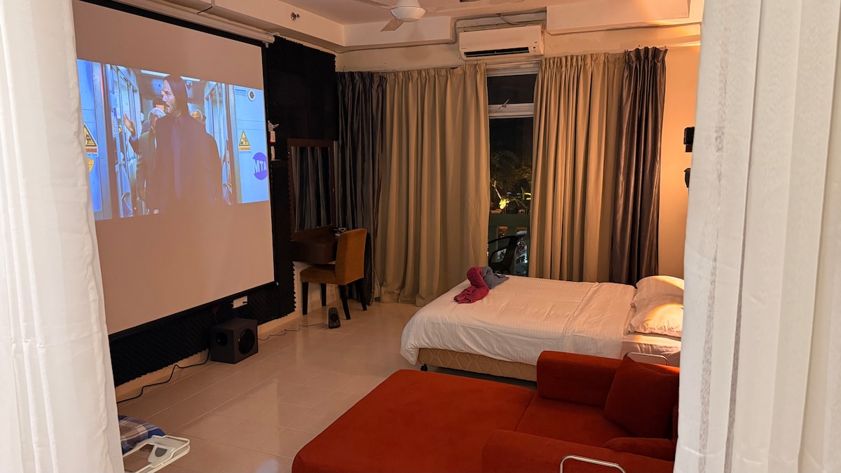You'll stay in a spacious conditioned studio that can accommodate up to 5 adults. This studio type apartment equipped with 2 queen size beds and 1 sofa bed. Free parking space and WiFi are available.