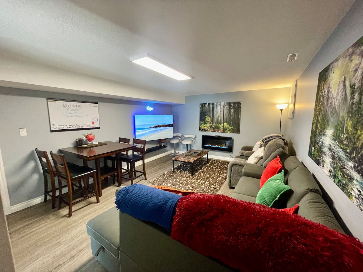 Experience the best of Kelowna at an affordable price with our cozy, centrally located suite. In a quiet neighborhood, our suite is just minutes away from delicious dining options, shopping, and Mission Creek. Plus, you'll be just an 11-minute drive from beaches and the downtown core. Our suite comes equipped with amenities to provide a comfortable stay, including a 65' OLED TV, 2 seat recliner, bathroom supplies, BBQ grill & seasonings, central AC, 2 electric fireplaces, and fenced yard.