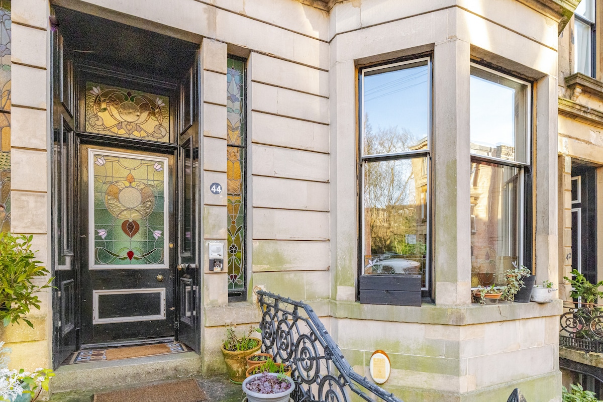 Fantastic, quiet location in the heart of Kelvinbridge, minutes walk to the park, the University, Art gallery and the shops, cafes and restaurants of the West End. Ground floor of an 1870s Glasgow townhouse, Grand living room- open fire, dining table. equipped kitchenette- fridge, ice box, cafetiere. Large, sunny bedroom, emperor bed, cotton sheets, natural mattress, heavy curtains . Plant filled bathroom, free standing bath, walk in shower. Fast WiFi. 50” tv. Alexa music. Heat controls