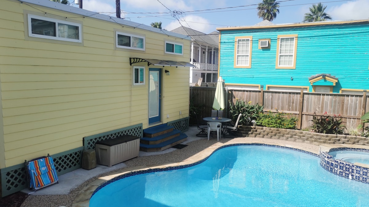 This Oasis is a poolside retreat in the heart of downtown Galveston. Close walking distance to restaurants, shopping, cruise terminals, and the best that the downtown has to offer. The Tiny sleeps 5 with a King, a Full size, and Futon sofa fold out. The private outside pool area gives plenty of room to stretch out, dine, and relax. The pool is a refreshing end to a hot summer day of beach fun or downtown shopping.