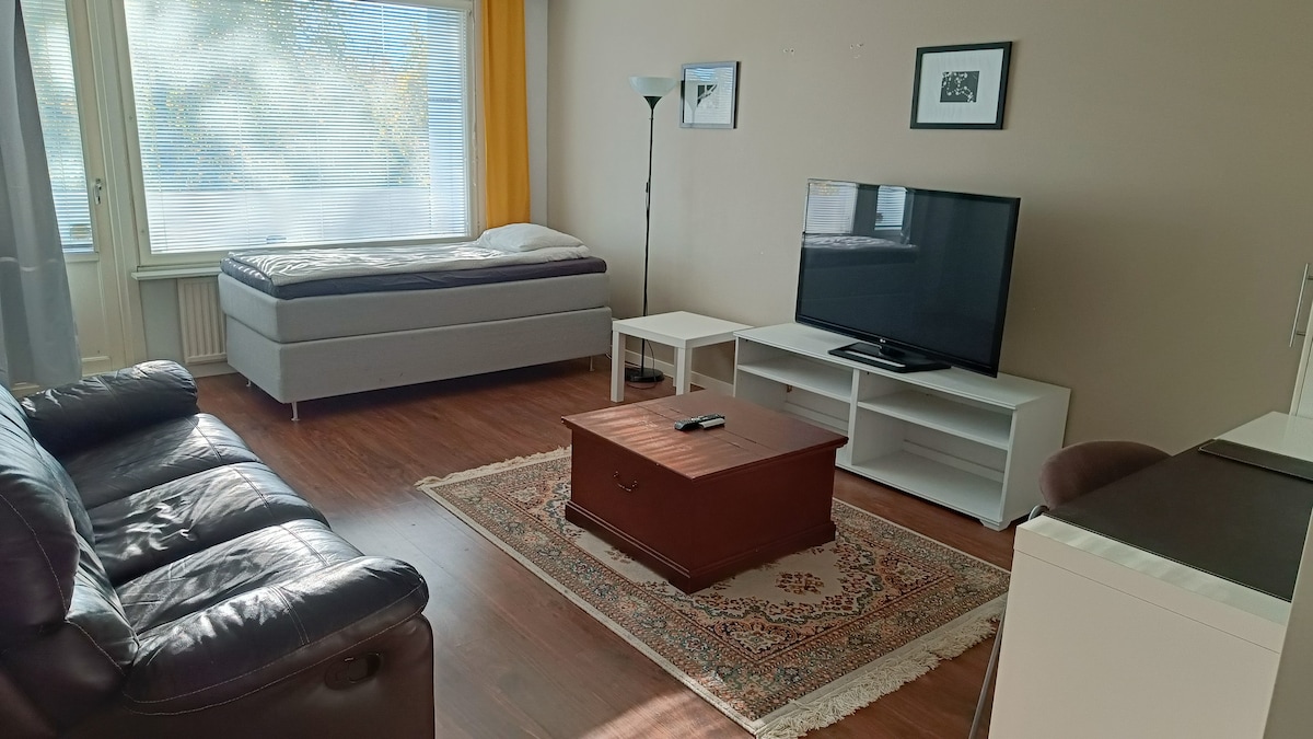 Kotoisa (44m2) yksiö omalla sisäänkäynnillä, erittäin pienellä suihku/wc:llä talomme yläkerrassa eli huomaa kuvat:portaat ylös! Meillä petivaatteet ja pyyhkeet kuuluvat Airbnb-hintaan, perusasiat keittiössä. Lyhyt matka keskustaan. Pihassa autopaikka. Keittiö, eteinen, pieni suihku/wc sekä olohuoneessa TV, levitettävä sohva, parisänky ja nojatuolit. Sopii parhaiten kahdelle aikuiselle, tai neljälle, kun seurueessa on esim.2 aikuista ja 2 lasta.