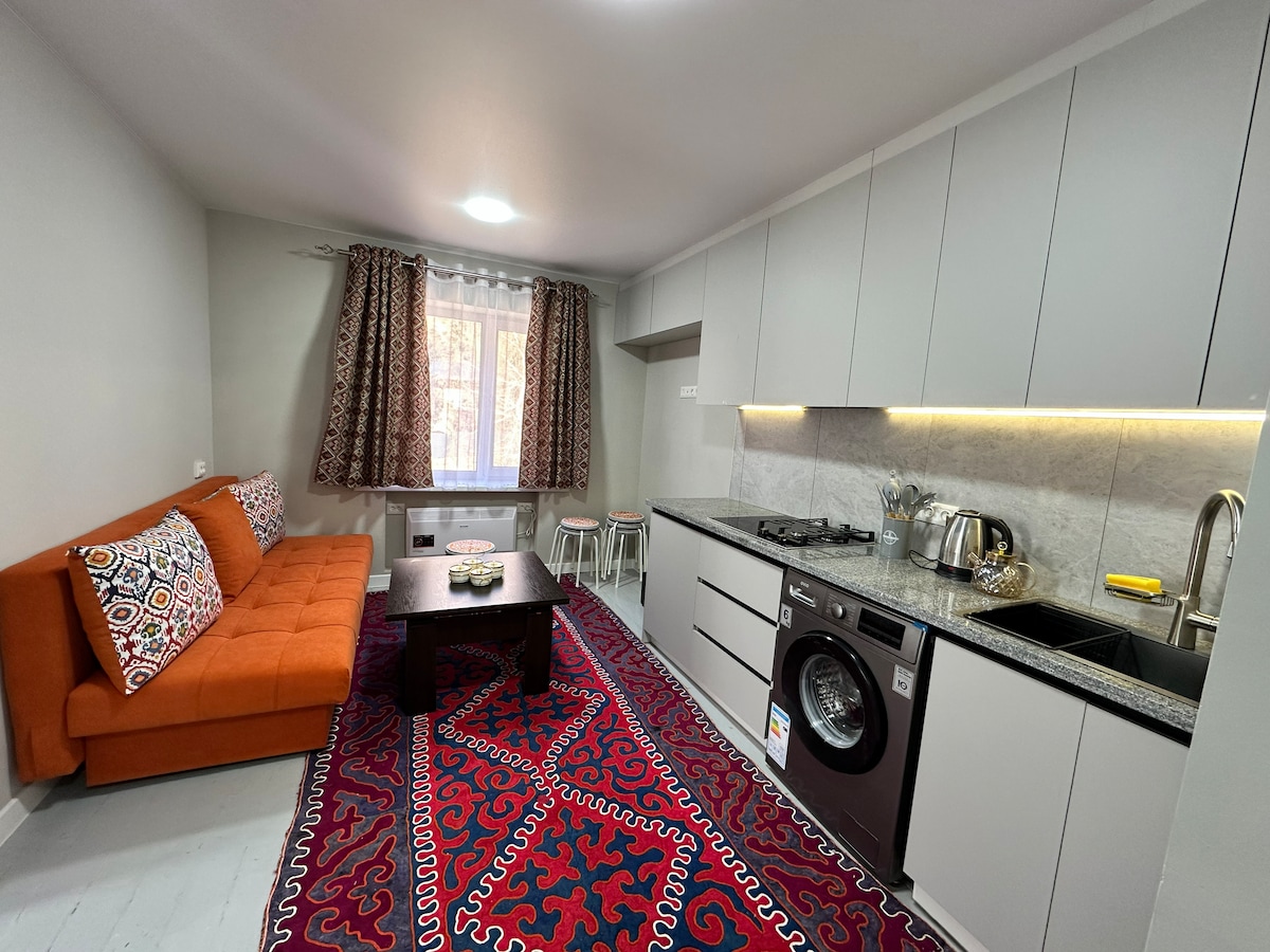 Уютная однокомнатная квартира у озера Иссык-Куль 📍 Булан-Соготту (Комсомол) Светлая и просторная квартира • Просторная однокомнатная квартира • 3 комфортные кровати (возможно размещение до 4 гостей) • Полностью оборудованная кухня: холодильник, плита, посуда • Душ, санузел и стиральная машина • Телевизор • Окна выходят на солнечную сторону — в квартире светло и уютно весь день Прямой выход к пляжу Тихое и спокойное место, идеально для перезагрузки и отдыха от городской суеты