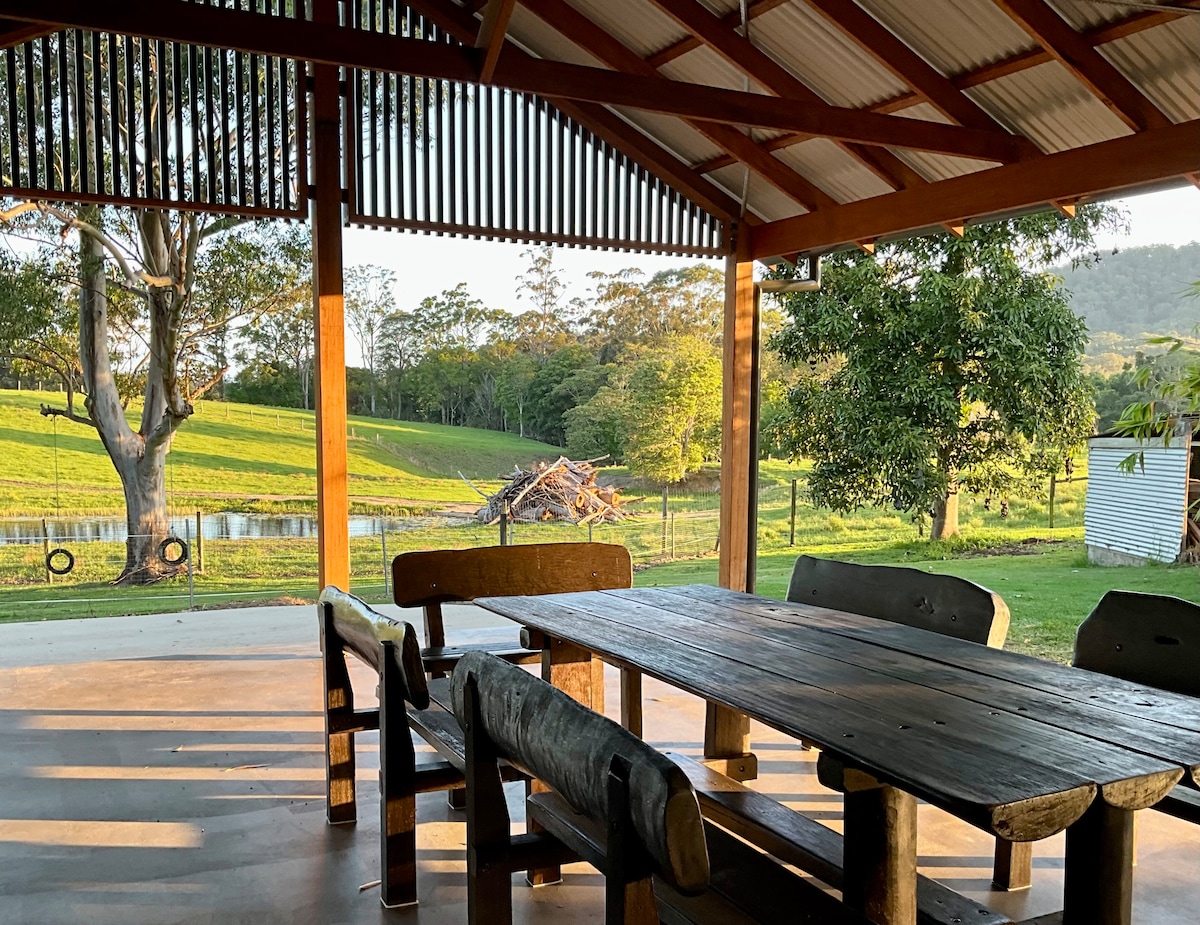 Bird Song is on fertile farm land on Kinchela Creek, only a few kilometres from Hat Head and South West Rocks on the Mid North Coast. It is only 10 minutes from Pacific Highway and an ideal stop over point or relaxing weekend. Our farm house has panoramic views across the country side and creek. The guest house with 2 bedrooms and one bathroom is adjacent to our house on an elevated deck which surrounds the swimming pool. Our farm has cows, horses, dogs, free range ducks, chickens & turkeys.