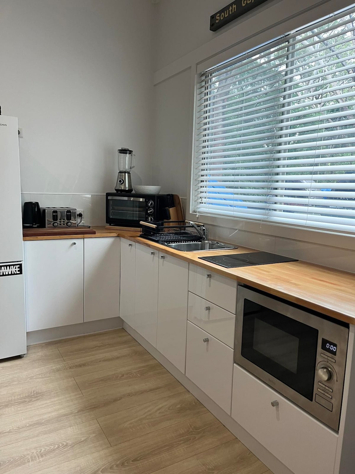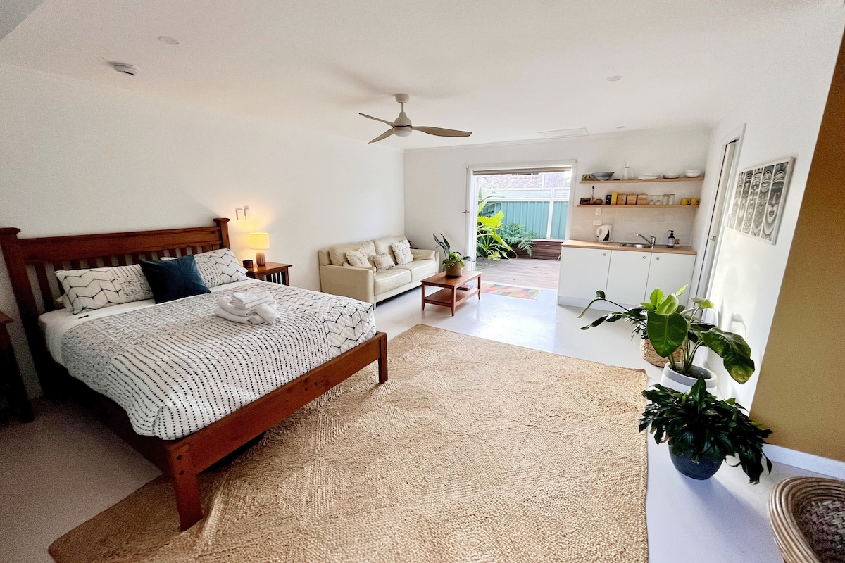 Cute couples retreat, pet friendly, for an overnight stopover or a minimalist staycation. The self-contained, private guesthouse features a bright lounge area (with kitchenette), opening up to a timber deck for relaxing afternoons watching the sunset; a fully functional bathroom with washing machine and dryer; and a bedroom bathed in morning sunlight with an enclosed courtyard for doggo. 🐾
