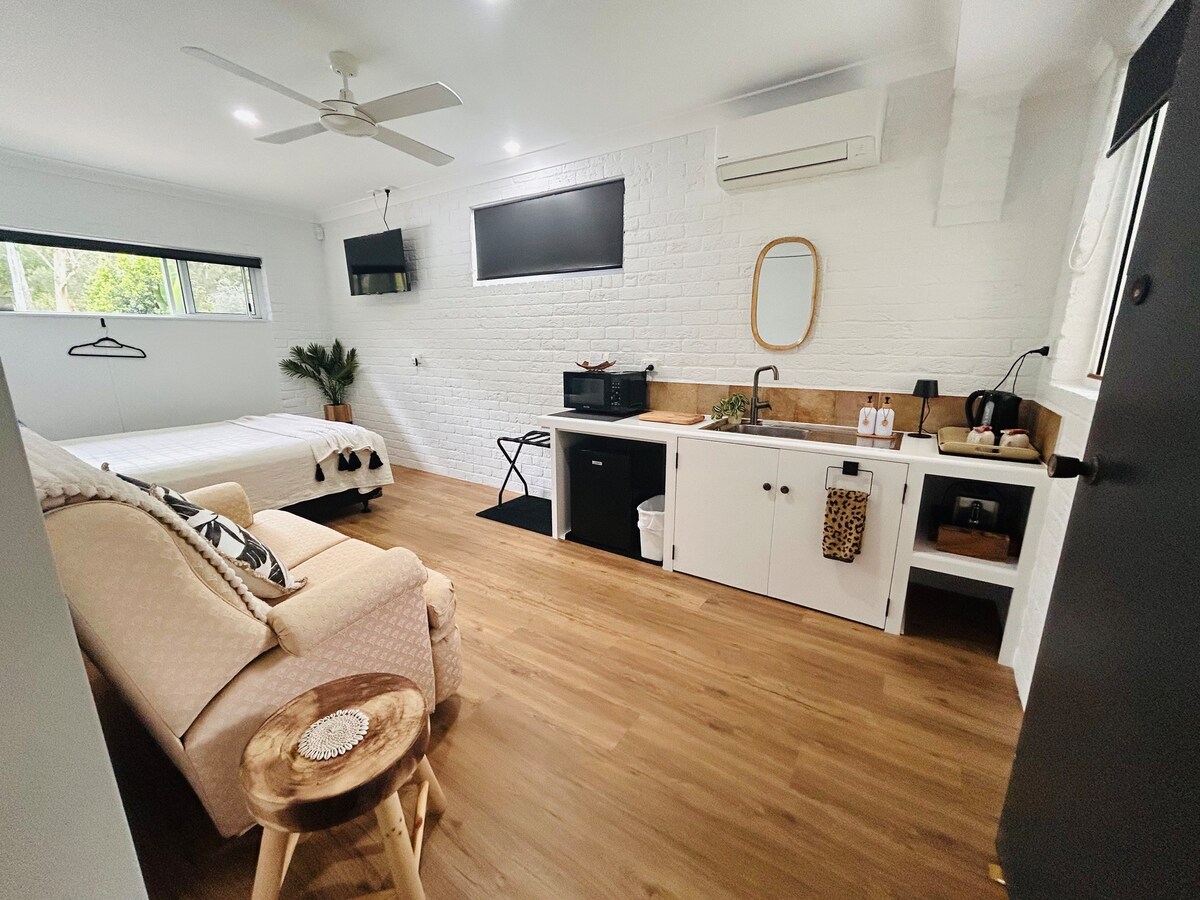 Nambucca Beach Getaway is a stylish studio suite. A quick stroll to main beach (500m) and a short walk (15 mins) into town, guests will have everything they need, including beach towels and a beach mat. Fall asleep to the sound of the ocean and relax to birds tweet. Guests can enjoy the seating area on the patio out front an undercover balcony out back with a BBQ and dining table. The king size bed which can be split into two long singles on request and for a small fee if needed.