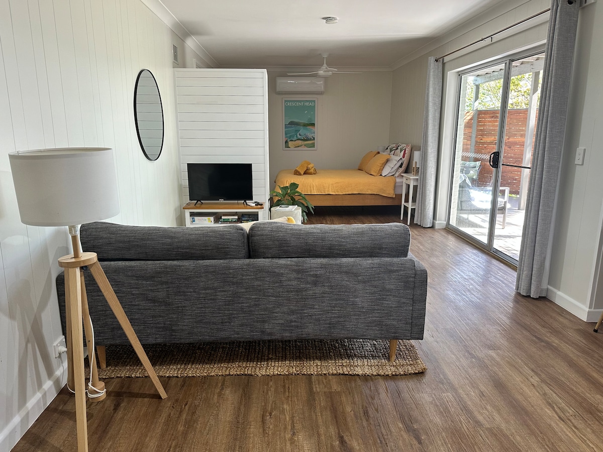 The perfect couples getaway. Large studio, private deck with garden views. Modern bathroom and European style kitchenette with dishwasher, washer and dryer. Short walk to back beach. Pets welcome. Please note we live next door in the main house and our dogs (GSD and Chihuahua) will bark occasionally. Neighbours also have dogs that sometimes bark. If you hate dogs, please book elsewhere. Please read policies and rules before booking with a pet. Note: you will hear some noise from the main house