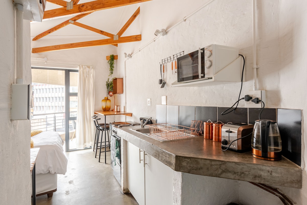 Escape to Industria - an eclectic steampunk studio in lush Hurlingham, just 2 km from Sandton. Industrial charm meets vintage elegance with repurposed decor, metro-tiled bathroom, and nods to 19th century innovation. Enjoy WiFi, solar power, secure parking, a flat-screen TV, and a garden view. The unit features a bath, shower, and convenient kitchenette - perfect for business travellers and curious souls alike. A rare blend of history, comfort, and creative flair in tranquil setting.