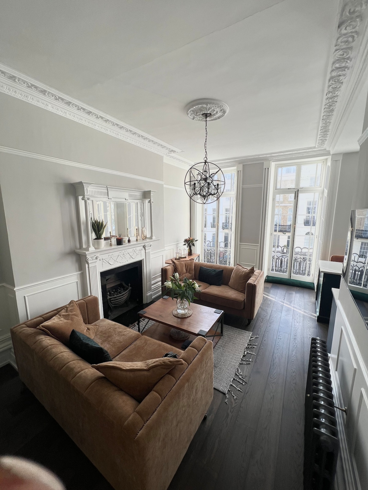 Enjoy an amazing stay in our gorgeous, centrally-located, first floor, balcony flat, set in a converted Regency building in Brighton's trendy Kemptown. Light floods in through 3 full length windows, which look out to sea. The flat has an accessible balcony; is full of original features: high ceilings with decorative plasterwork, fireplace & the original wooden shutters; as well as GCH, open plan, well equipped, kitchen, smart TV, newly fitted walk-in shower (no bath) & a cosy double bedroom.