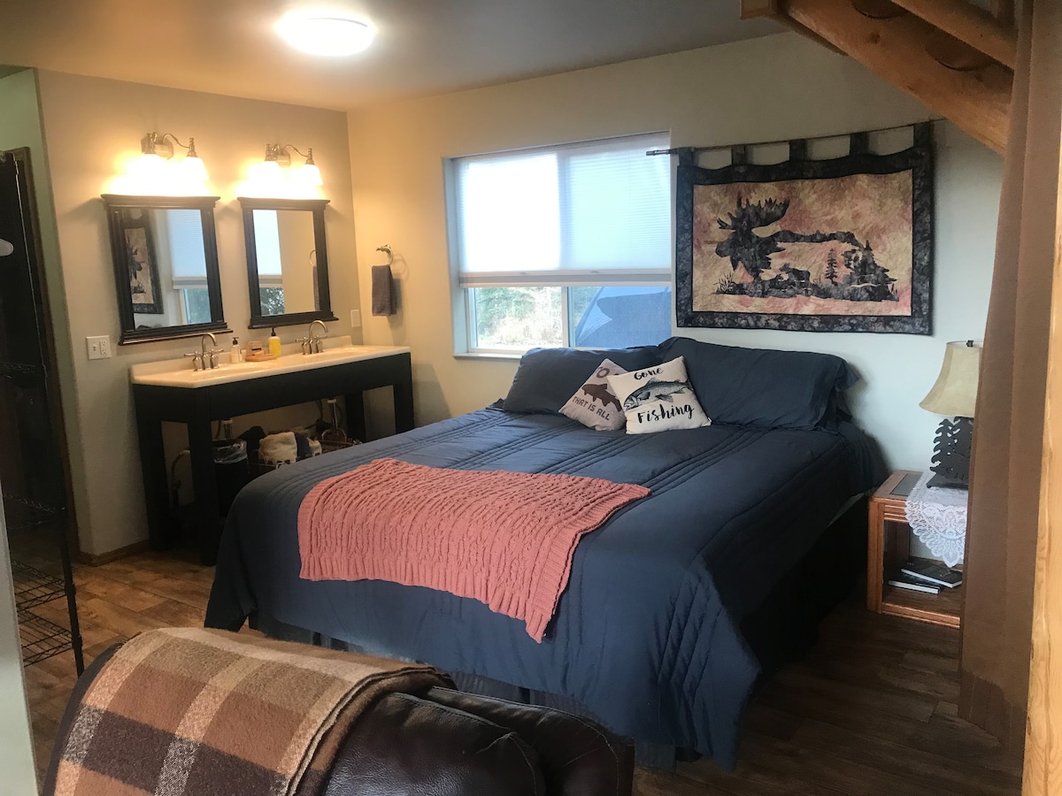 Desirable Mackey Lake location in Soldotna. Close to town, but still private. Our newly renovated studio apartment with lots of natural light offers a fully furnished kitchen with dining area. The twin beds allow for a friendly getaway, or can be combined into a king sized bed for a couples retreat! We are minutes from the Kenai River and other local attractions. This apartment has everything you need to make your trip enjoyable and comfortable!