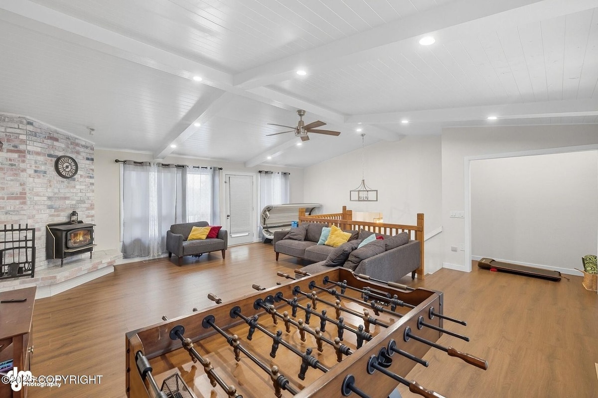 4 Bears is a comfy 1-acre hideaway at the end of a quiet lane. 3 Bedroom & 2 Bath one story home, plus a den w/ full bed, perfect for families & fishing trips. Just 10–15 mins to the Kenai River. Kick back on the deck, fire up the grill, and warm up by the fire pit (we’ve got the firewood and hot cocoa!). Garage for your gear & chest freezer for your catch. Games, cards, darts, & cornhole. Need an extra bed? Twin rollaway is great for a kid or teen!