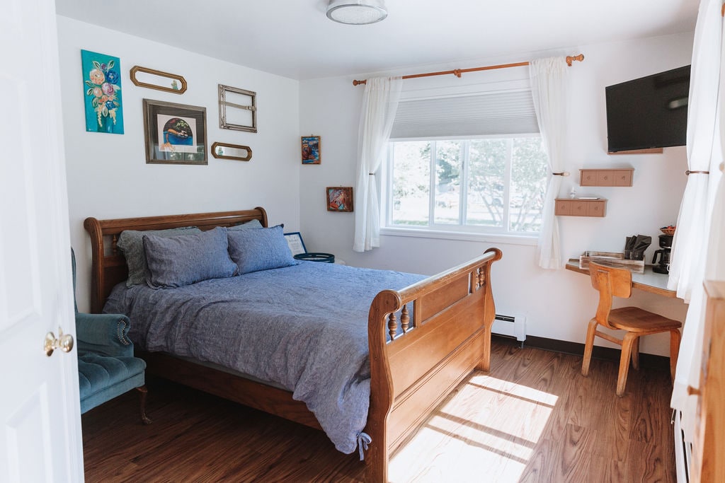 A single private unit located upstairs in a two-story duplex. The suite includes two private bedrooms, each with a queen bed, a living/dining area with couch and table, and a full kitchen stocked with dishes and basic cookware. The bathroom includes a stand up shower, no bathtub. Each suite also features a private balcony with the best view in Seward! Access to a shared hot tub, (extra fee), is included with rental of this unit