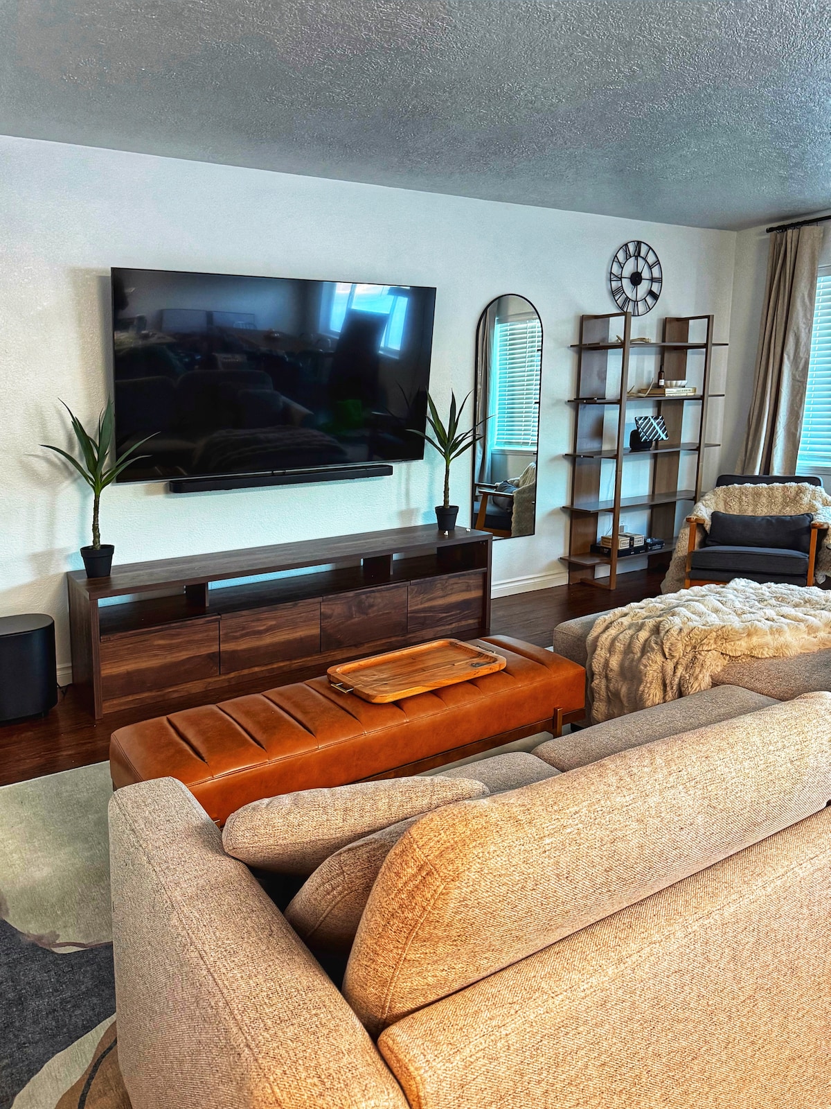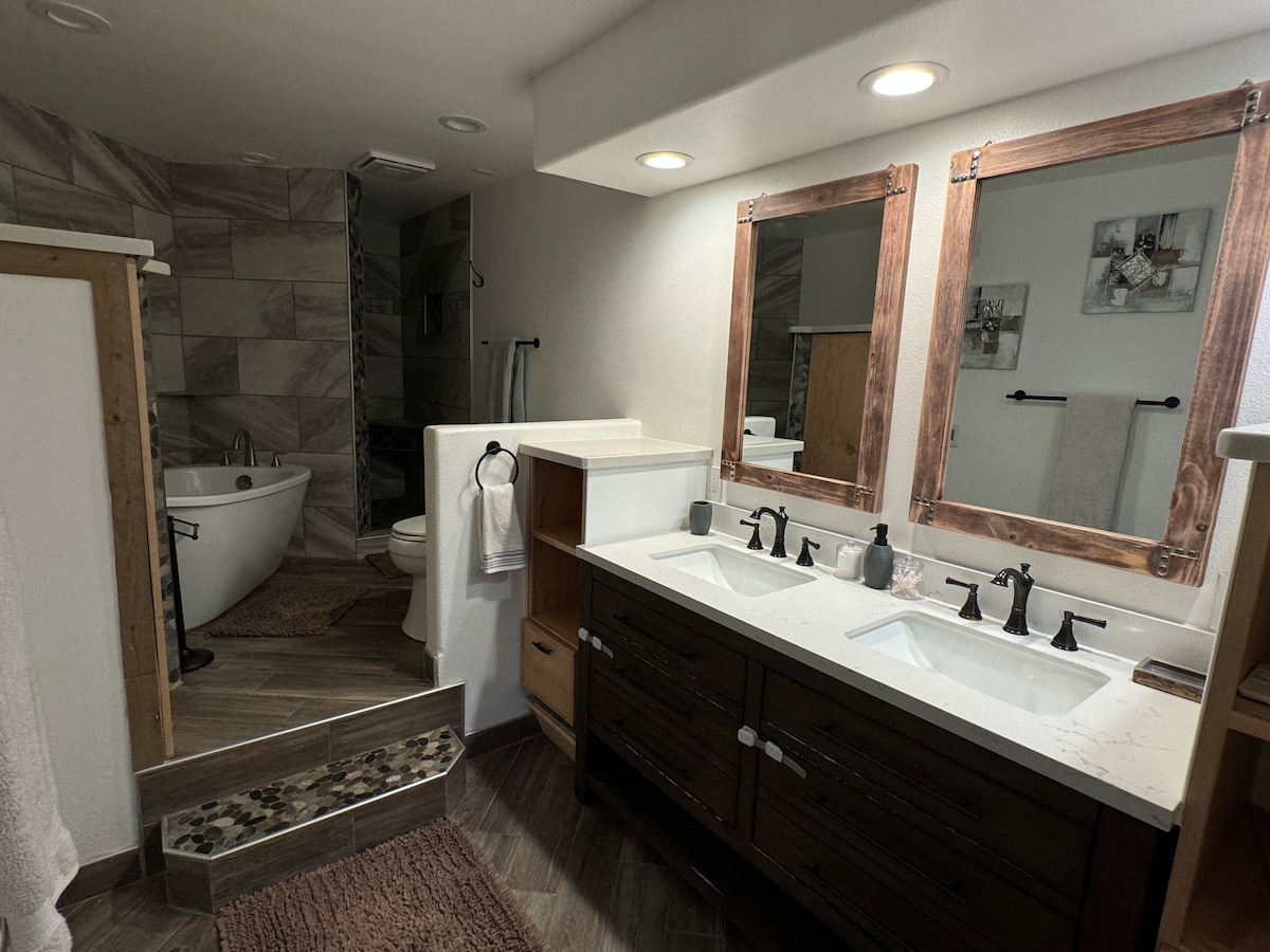 Step into a light-filled retreat designed for connection. This contemporary home features exposed beams, local art and oversized windows that invite the outside in. We prioritize your well-being with premium, plush mattresses throughout for an undisturbed night's rest. The master suite is a true oasis, with a king-size bed, twin size sleeper sofa, and a rejuvenating rain shower. The two additional bedrooms feature queen-size beds and cozy bedding.