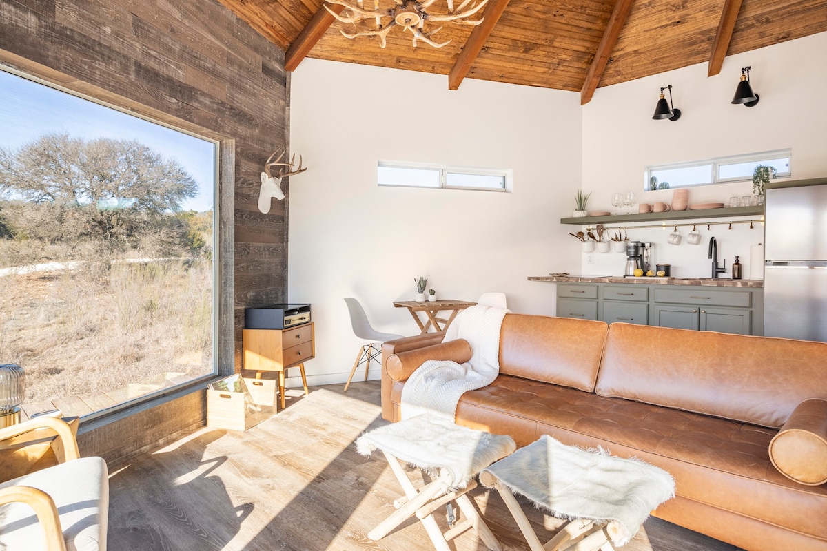 Soak under the stars in your private hot tub, sip wine by the fire pit, and wake to deer outside your window. This secluded cabin was designed for couples to reconnect — with luxury details, wraparound views, and access to a new outdoor lounge with cedar sauna, fire pit for six, string-light dining under oak trees, and a horseshoe pit. Over 200 guests have rated us 5 stars for romance, design, and peaceful vibes. Over 200 guests have rated us 5-stars for romance, cleanliness, and design.
