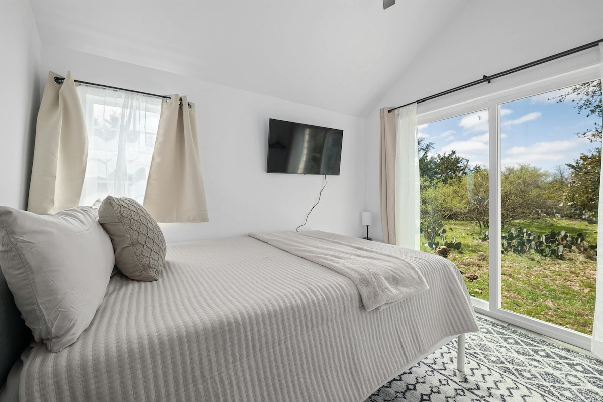 Welcome to North Star Nook, a pet-friendly, one-story sanctuary on Twilight Ranch, just 30 minutes from downtown Fredericksburg. Enjoy panoramic Hill Country views through large windows, witness local deer, and revel in the cozy privacy of this serene retreat. Say hi to our resident Llama, goats, and horse! Queen bed, TV, cozy bath w/shower, and kitchenette w/ rustic charm, modern comforts, & an on-site steward, Amy, North Star Nook offers a seamless escape to the beauty of the Hill Country.