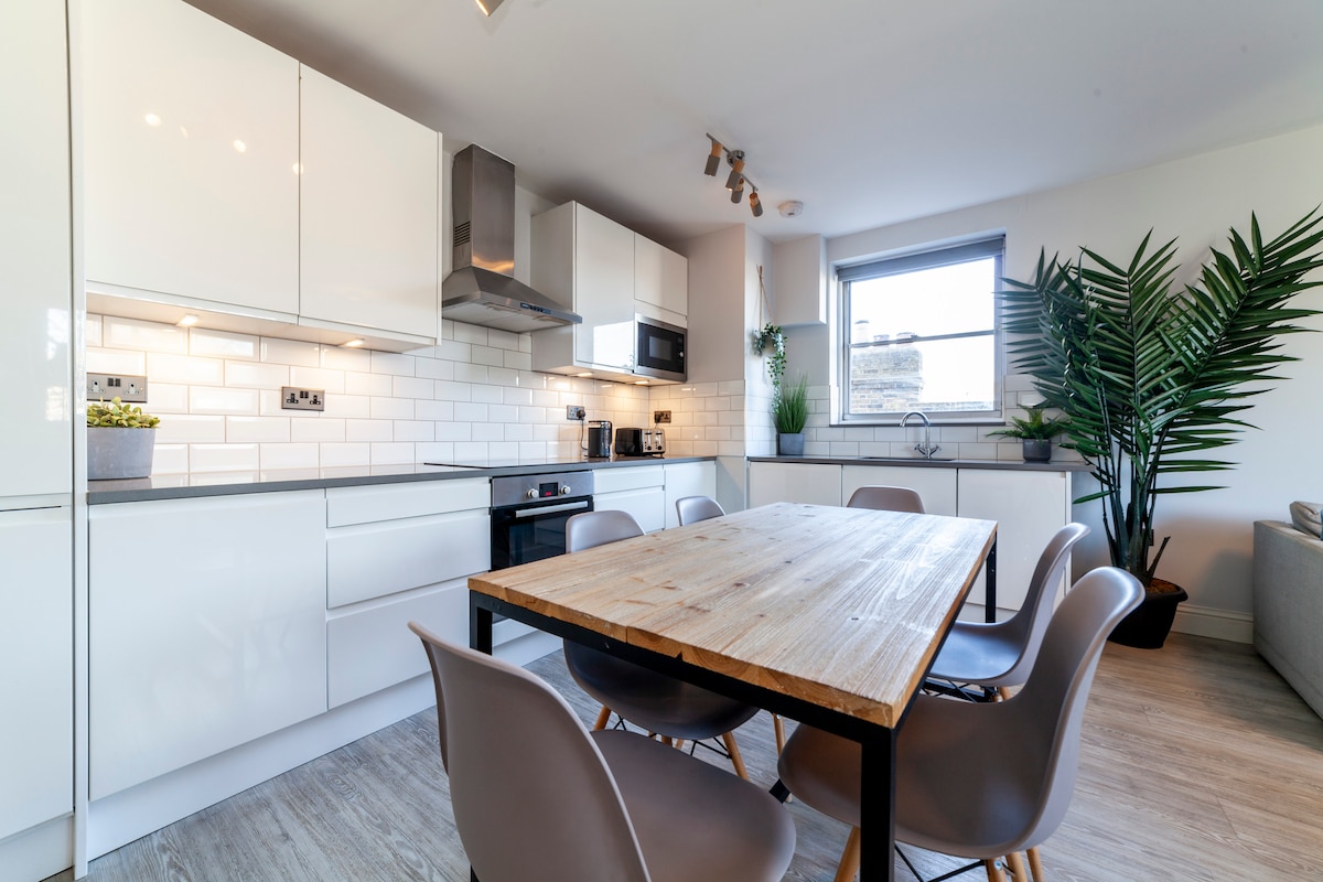 Begin the day with a cup of tea on the sun-washed roof terrace before returning to a sparkling white kitchen to make breakfast. A comfy sofa offers a delightful spot to read a book within this crisp apartment in a charming Georgian building. This brand newly refurbished top floor flat is centrally located within minutes of Fulham Broadway tube, giving you versatile access to all of Central London. A bright and airy reception room enjoys a brand new kitchen with convection hob, oven, fridge, microwave and a Nespresso coffee machine. The open plan kitchen/ living room enjoys a bespoke fitted bench seating area. The reception has USB ports for charging your phone (please bring your phone cable) and a newly installed TV with Netflix. The reception rooms opens out onto a south west facing terrace overlooking mature trees that lead to the park. A perfect spot to enjoy a morning coffee or an early evening drink, enabling you to soak up the buzzy atmosphere. Free Wifi is available. The bedroom suite enjoys bespoke fitted wardrobes with hangers and a brand new ensuite shower room with rain shower and feature lighting. We supply one set of fresh linen for your stay, Nespresso coffee, tea, milk, sweeties and a bespoke handbook to guide you to local restaurants and necessities. Whether your stay in London is for business, touring, shopping or simply pleasure, this is an ideal central location in London. To the rear of the building is access to coffee shops/ restaurants and a delightful park, with Boris Bikes available to rent should you fancy taking a tour. 07703004354 - I am virtually 24/7! There is a bus stop just outside the apartment with routes that offer short trips to popular London attractions. Harwood Road Apartments are ideally located very close to Fulham Broadway, giving you access to the whole of central London via the underground network and multiple bus services. The area has a buzzy vibe and a large collection of restaurants and shops offering a wide range of cuisine from French (Cote Brasserie) to Thai (£9.95 for a two course lunch opposite the flats) to Byron Burger to an Oyster Bar. There is a gym, cinema and a beautiful park (with tennis courts) all within a stones throw!