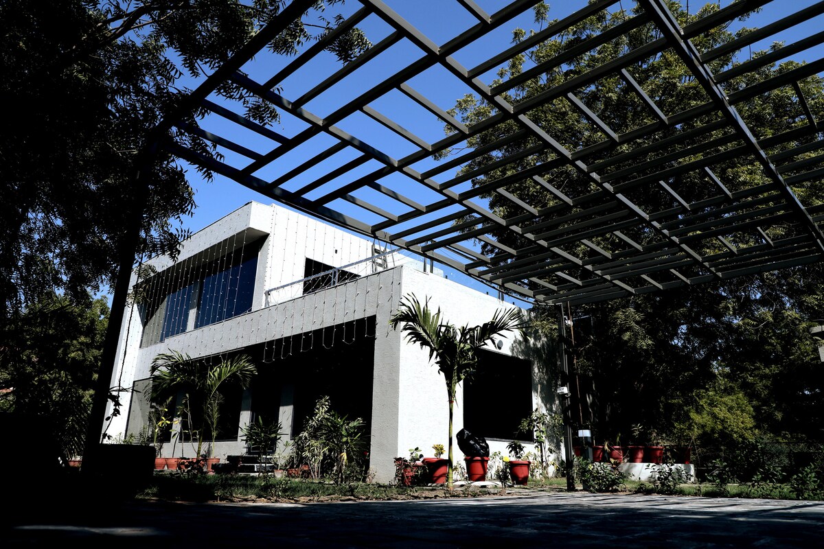 A charming countryside farmhouse, conveniently located just 2 mins from Sindhu Bhavan Road (SBR) and 4km from Zydus/CIMS Hospitals. The house is fully air conditioned, has free WiFi, a well equipped kitchen, a plunge pool and a large garden. Perfect for corporate travelers and medical visits. Enjoy 1-night stays, seamless Instant Book, and a dedicated workspace with fast Wi-Fi. The villa is located in a secure, gated society in Shilaj, close to premium cafes and the SG Highway business hub.