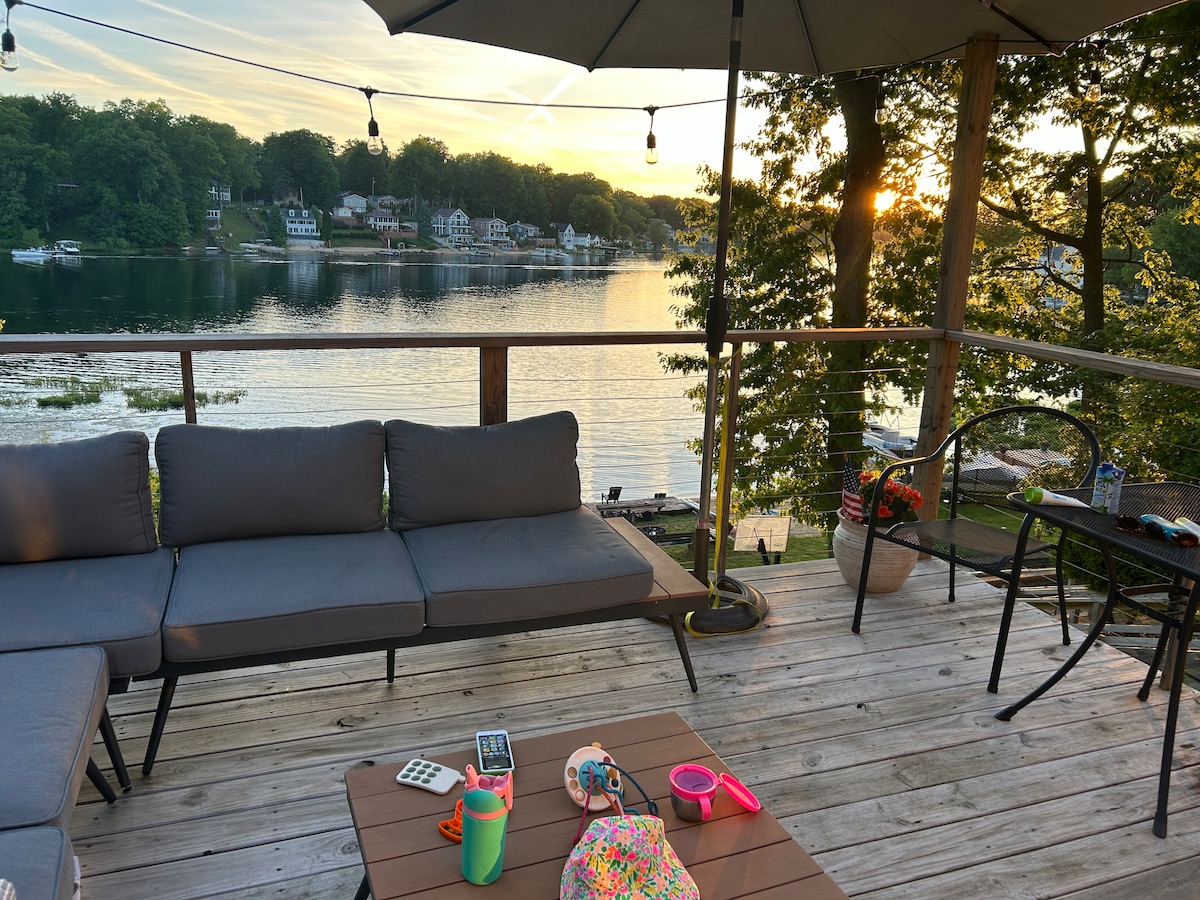 Nestled in a small cove on a large lake, this waterfront cottage has been completely renovated. It has 66' of private shoreline; an elevated front deck plus side patio; and stone bonfire pit & gas BBQ grill. Guests also get FREE & exclusive use of pontoon boat, 2 kayaks and paddle boat, plus private dock (early May through late October, weather permitting). Swan Cottage is very dog-welcoming. The yard is not fenced, however we provide ground stakes & cable ties.