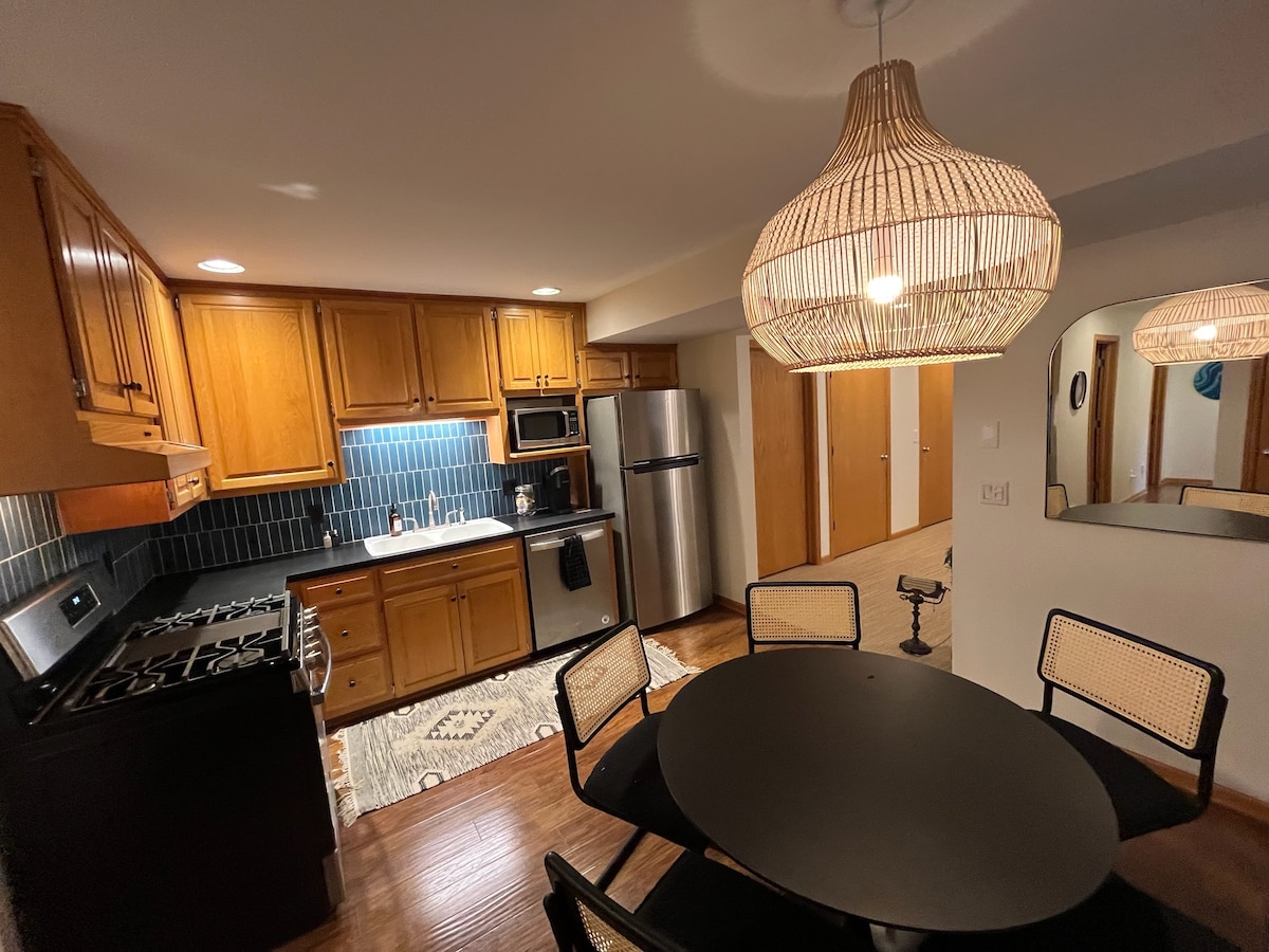 A lovely and large indoor and outdoor space that is quiet, serene, and comfortable with all brand-new (2023) beds, furniture, TV, kitchen appliances, carpet, and more. Professionally cleaned and maintained, this nearly 2400 square foot unit is yours to relax in. A walk-out patio with amenities, a full kitchen, large living area, two full bathrooms (shower & tub), two bedrooms (King & Queen), locked exercise room, and full laundry area. *the house is divided in two- the owners will not be there*