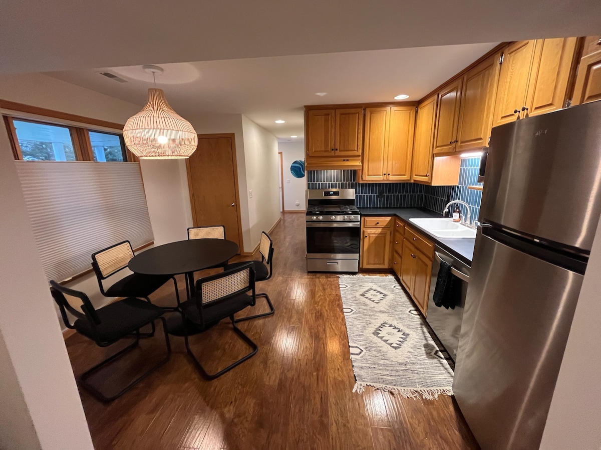 A lovely and large indoor and outdoor space that is quiet, serene, and comfortable with all brand-new (2023) beds, furniture, TV, kitchen appliances, carpet, and more. Professionally cleaned and maintained, this nearly 2400 square foot unit is yours to relax in. A walk-out patio with amenities, a full kitchen, large living area, two full bathrooms (shower & tub), two bedrooms (King & Queen), locked exercise room, and full laundry area. *the house is divided in two- the owners will not be there*