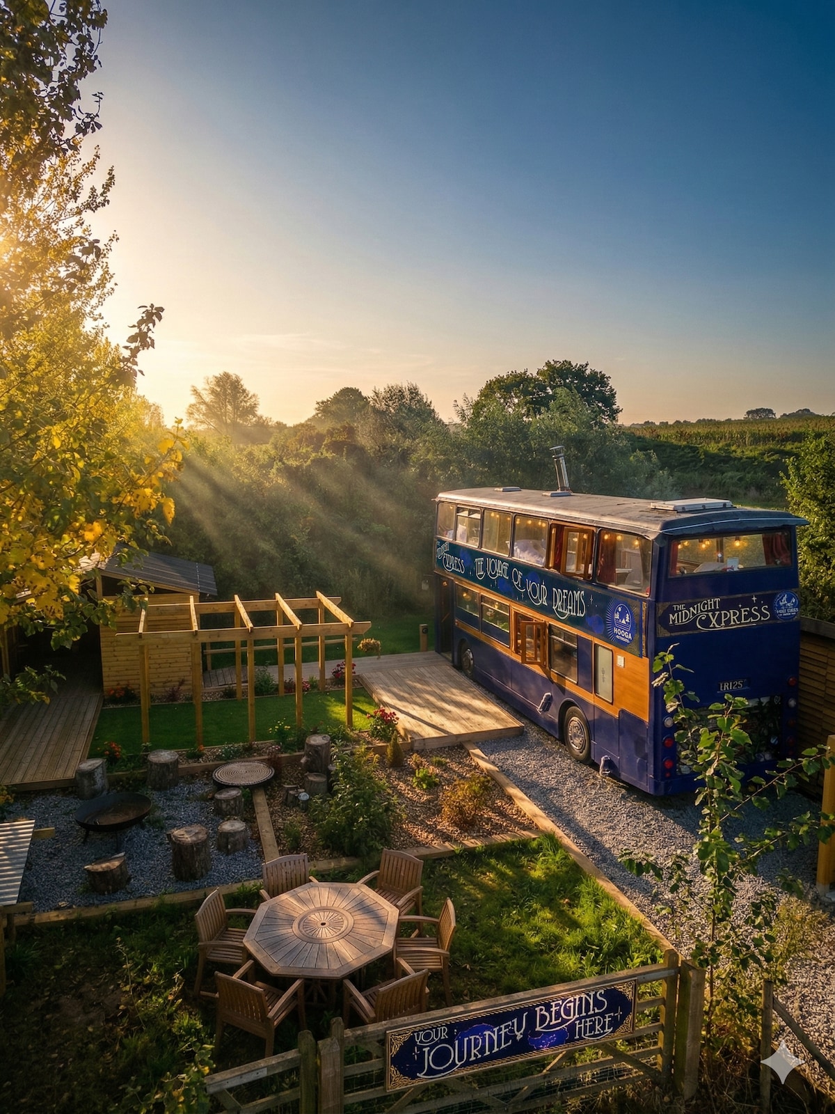 Probably the most magical bus in the UK, it is anything but ordinary. Inspired by Harry Potter and the Orient Express x Roll top bath with TV in the master bedroom, video gaming area in the drivers seat, wet room, formal dining area that converts to lounge and TV snug. Also a First Class waiting room outside for extra space for group activities! Fantastic views of the countyside and river, log burner, central heating, she is set up for use all year around - magical!