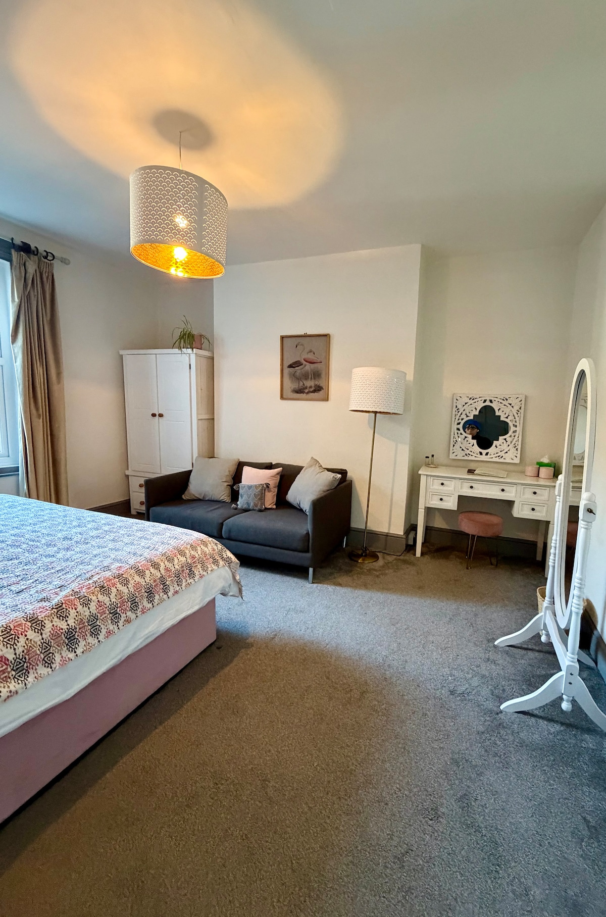 A stylish and spacious room in a large period house in central Margate with a bay window overlooking Dreamlands and the sea. This room sleeps 2 in a hotel standard Super King bed with deep mattresses and hypoallergenic, Egyptian cotton bedding. The bed also be converted into 2 single beds to make a twin room. Chill out in the large and airy shared lounge and dining spaces, relax in the courtyard garden and hot tub or make the most of Margate's beaches that are just 5 minutes away.