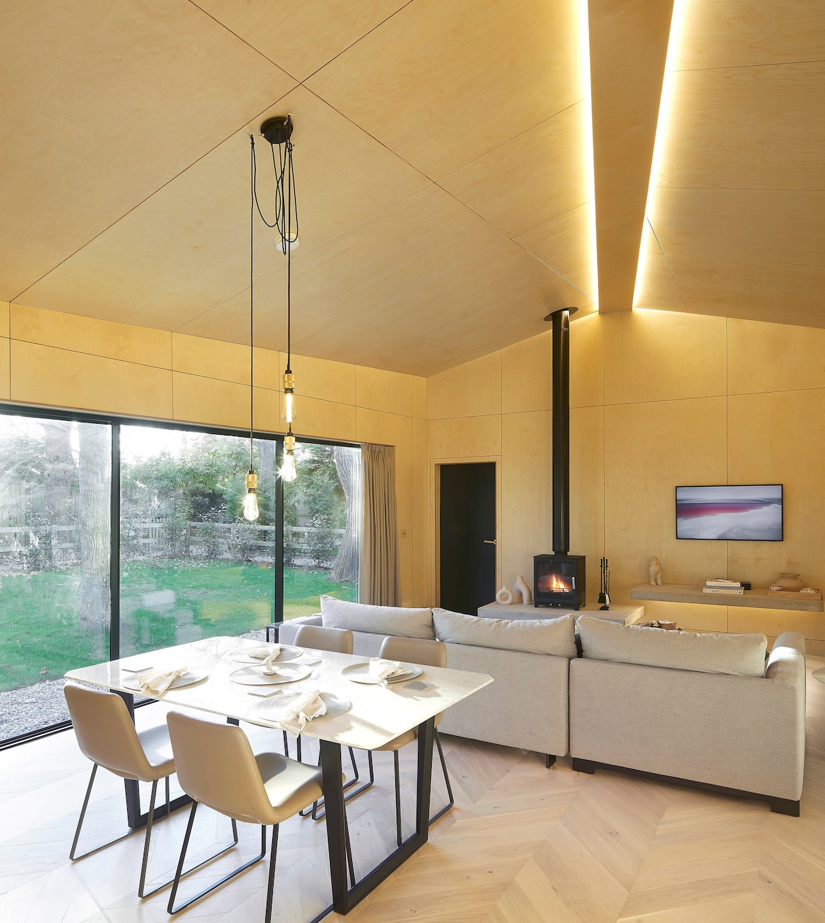 A warm, stylish, peaceful retreat, perfect for a winter break, with seaside walks and cosy pubs a short stroll away. Treat yourself to a relaxing sauna with bracing cold plunge in the garden spa which is paid for separately. Enjoy Whitstable's great restaurants and cosy cafes. Alba Lodge is a double height space, designed with sustainability in mind. Drift off to sleep in the king size bed. Freshen up in the large walk in shower. Sauna and cold plunge is £30 per couple, per session.