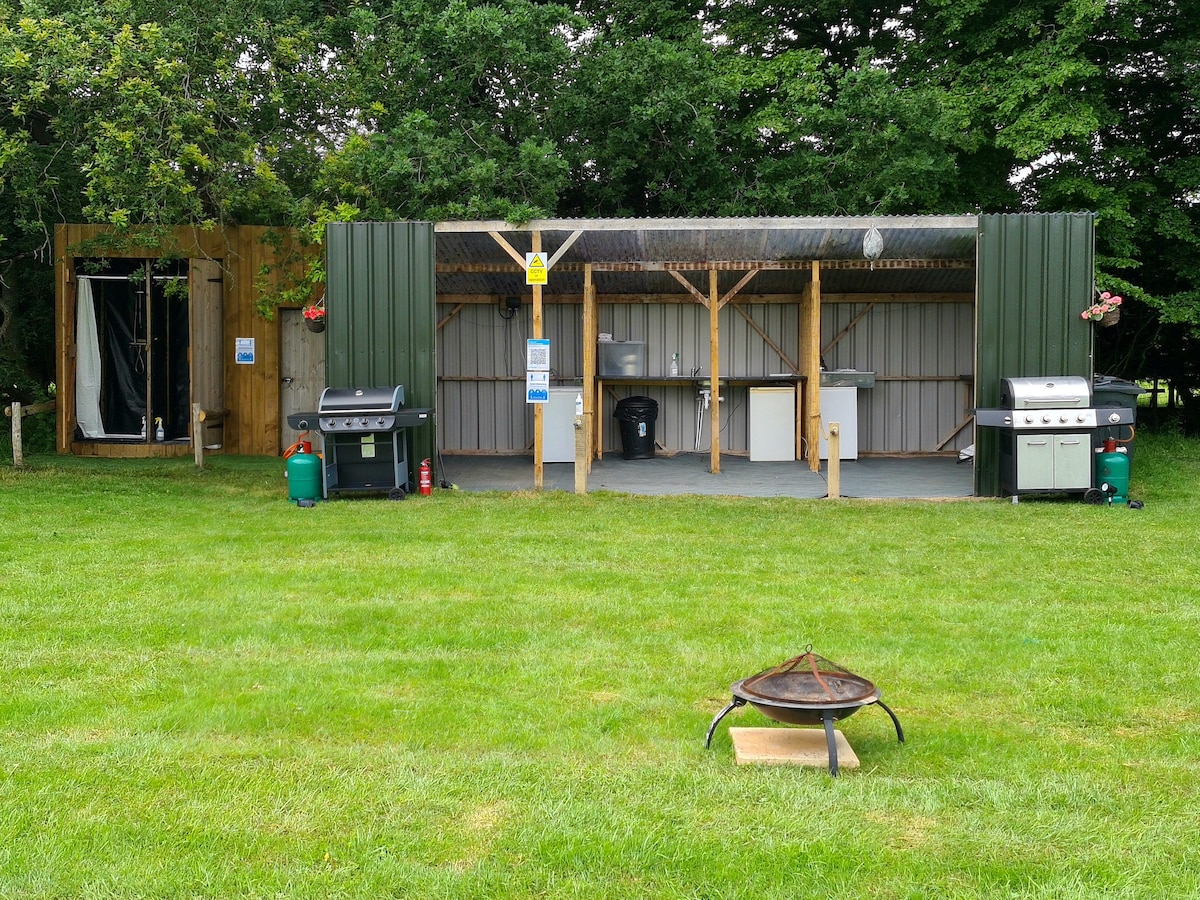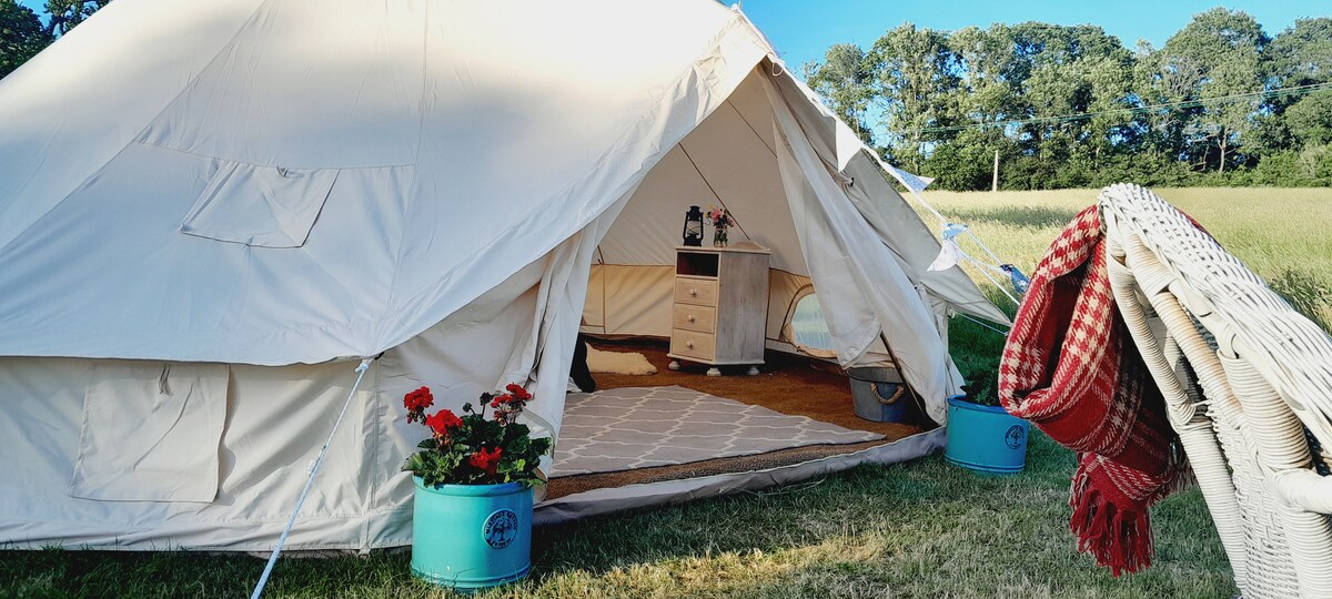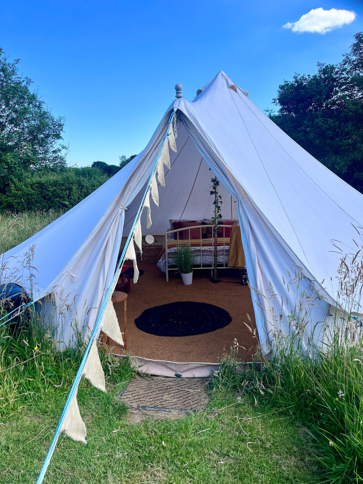 Tibbs Farm, one of three 5m Bell tents set within the heart of our working farm in our old apple orchard. Our picturesque farm to fork cafe is a 10 minute walk from the tents, with hearty breakfasts, tasty lunches, good coffee and homemade cakes waiting. With mains drinking water, private off grid WC and a rustic heated outside shower block. Please note towels are not provided. Our tents are available during the summer period. Please note: we are a working farm with livestock.