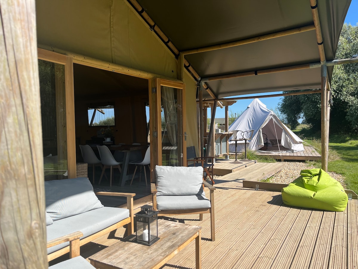 Beautiful quiet site with spectacular views, nature & sunsets. Wheatfields has two self-contained luxury Safari style tents 60m apart. The tents offer flexible accommodation for families or friends with Bell Tent included. New Hot Tub for 2025. Contemporary designed interiors, individual luxury shower rooms. Fully equipped kitchen, Top quality bedding & towels. Wood burning stove. Short drive to the historic town of Rye and great beaches. Only two hours from London and you can bring your dog too