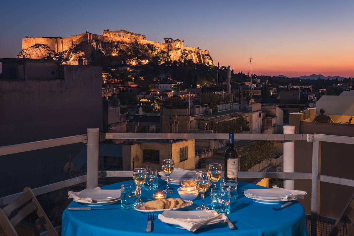 Two floors apartment with a stunnishing view of acropolis , 2 minutes walk from the metro station Thisio and at the beginning of the pedestrian which leads to Acropolis.. Balcony and roof garden. Air condition in all the bedrooms. The house has natural gas heating system too. Internet and TV. Fully equipped kitchen. Mattress toppers with memory foam.
