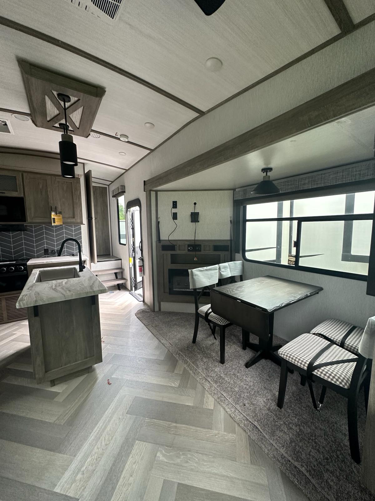 This spacious and modern RV has all the features you need for your next adventure! It can sleep up to 8, with a spacious modern interior, featuring modern appliances, a private Master bedroom, and even an island sink. The Kitchen is equipped with a refrigerator, stove, and microwave. And let's not forget about the private bathroom with a shower and abundant storage for your storage needs. Plus, the large panoramic windows provide amazing views of the great outdoors.