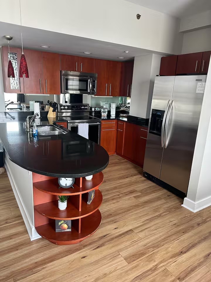 Experience Louisville in style from this upscale apartment, perfect for up to 4 guests. Sleep easy on a plush king memory-foam bed or queen memory-foam sleeper sofa, then start your morning with complimentary coffee. Step outside to walkable dining, entertainment, and 4th St. Live! Wind down with virtual golf, the 24/7 gym, or a movie night with Hulu and Disney+. Comfort, convenience, and a true city experience book your stay with us today!