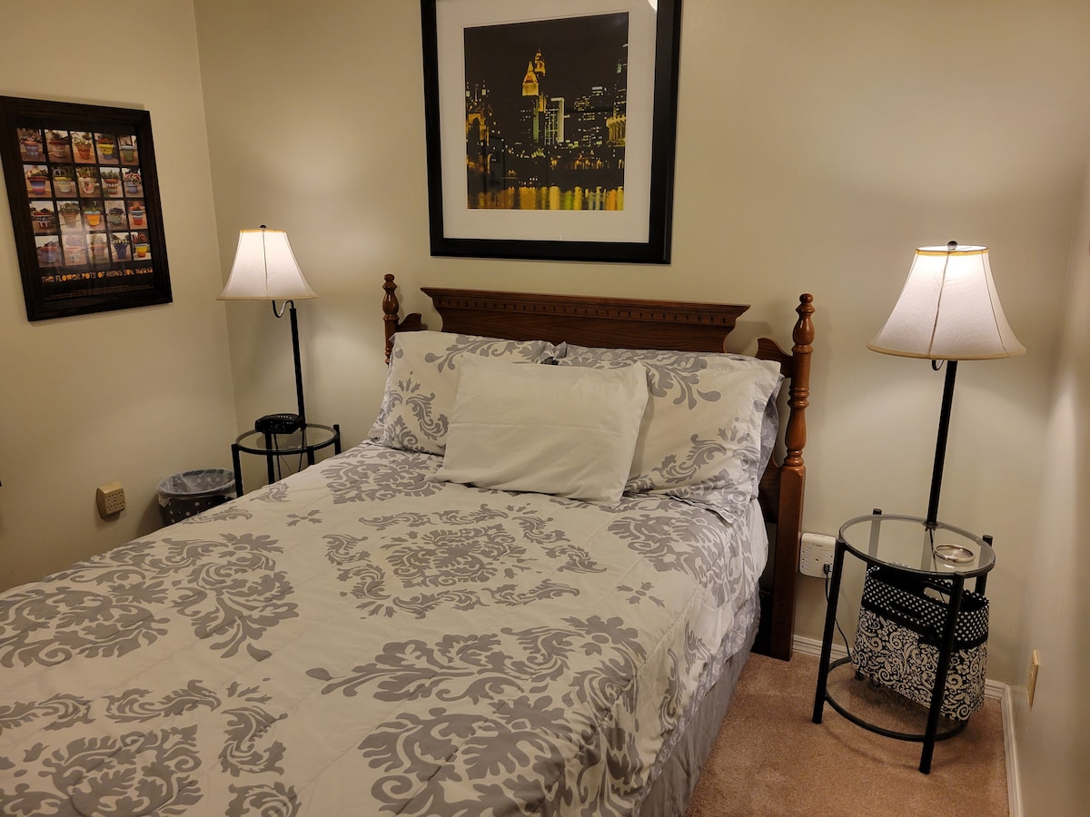 SHORT TERM RENTAL SPECIAL LICENSE # 15085659. Private downstairs suite: bedroom and den, plus a bath w/ small shower, in a quiet, safe neighborhood. (Hosts upstairs). Entry via garage side door w/ key. Roku TV, stereo, fridge, microwave, sofa which folds out in den, for up to 4 guests total (if 2 guests need sofa, specify 3 guests to add $10 fee). Five miles to airport & horse track, 3 mi. to shops/restaurants, minutes from scenic horse country drives. Tesla EV charging $10 overnight.