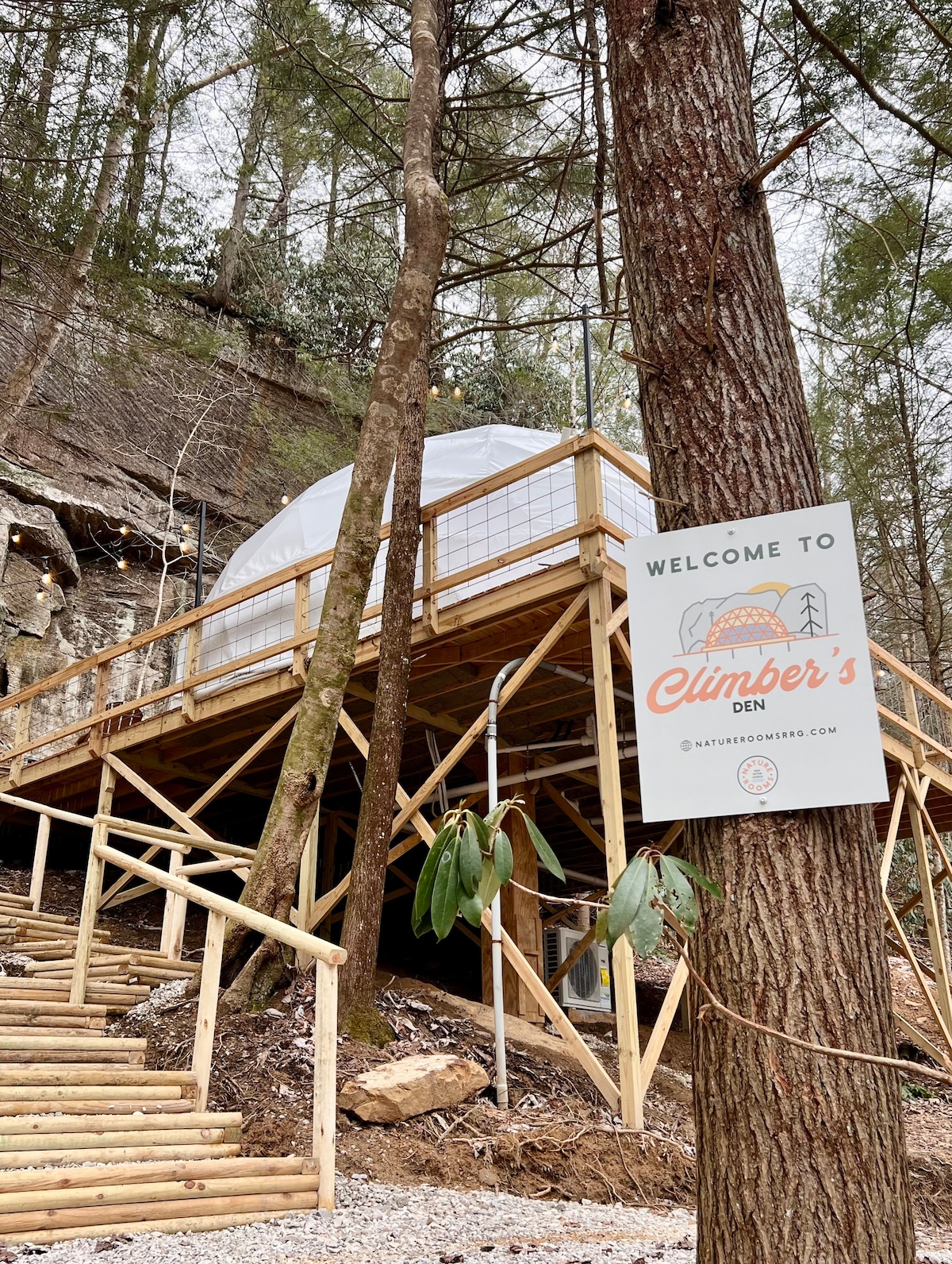 Climbers Den: rare, elevated stay in Red River Gorge, this property offers the perfect setting for an upscale glamping experience. This newly-built dome combines modern design with earthy textures- giving you a "home sweet home" type feeling. Bring your crew over the river and through the woods to our 26-acres of woodlands, with free access to Spirit Lake. Located 15 mins. from Natural Bridge State Park in Daniel Boone Nat. Forest. Come hike, climb, & explore the good ole outdoors! *4WD REQUIRED