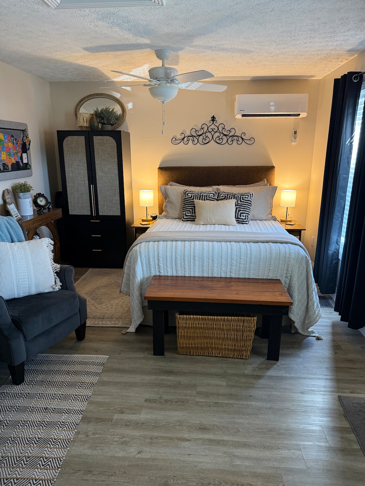 This suite is a beautiful private retreat complete with a projector for watching your favorite streaming service for the ultimate movie night. Centrally located and within 10-20 minutes of numerous local hospitals, universities, as well as various restaurants and downtown destinations, our guest suite offers a peaceful retreat in a convenient and safe location. We also provide a fold out desk that guests can use for a remote work space if desired.